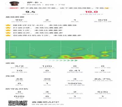 萨卡本场数据:2射1传+3关键传球,评分9.4全场最高