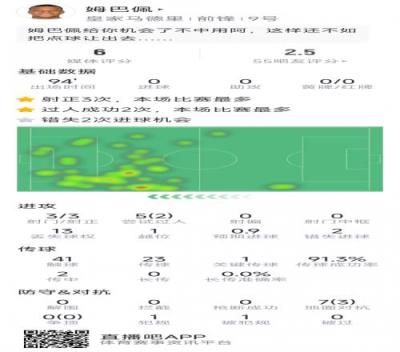 姆巴佩本场数据:3次射正,2次错失良机,罚丢点球,评分仅6分