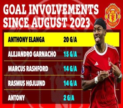 2023年夏窗,伊兰加以1750万欧元的转会费加盟诺丁汉森林,至今代表诺丁汉森林出战55场英超,贡献8粒进球12次助攻,直接参与20粒进球。同期曼联阵中,加纳乔参与15球、拉什福德参与14球、霍伊伦参与14球、安东尼参与2球。