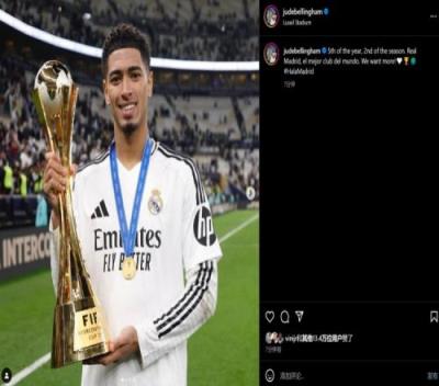 体育资讯12月19日报道宣称 洲际杯决赛中,皇马3-0完胜帕丘卡,夺得冠军。贝林也更新了社媒,庆祝球队再添一冠。