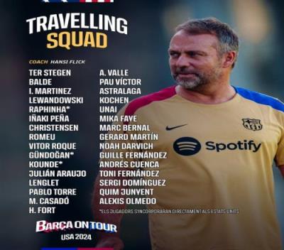 体育资讯7月28日报道宣称 巴萨将前往美国参加季前赛,对阵曼城、皇马和米兰,巴萨官方公布了美国行的大名单,莱万、京多安、拉菲尼亚在列。阿劳霍、佩德里、加维、德容、法蒂因伤缺席,亚马尔、费兰-托雷斯获得额外假期,费尔明、库巴西、埃里克-加西亚参加奥运会。