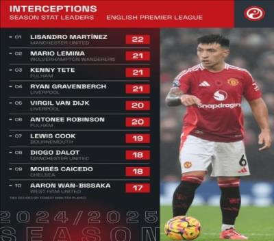 附英超本赛季拦截次数榜: