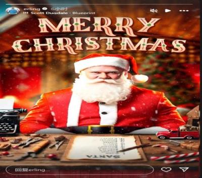 哈兰德在社交媒体上晒出圣诞海报,将自己P成白胡子圣诞老人的模样,图片上有“圣诞快乐”字样。