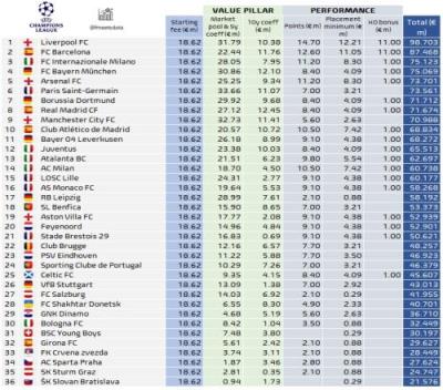 体育资讯01月23日报道宣称 专业足球数据媒体footballmeetdata计算了本赛季欧冠奖金,其中利物浦近1亿欧居首,巴萨第2,皇马第8曼城第9。