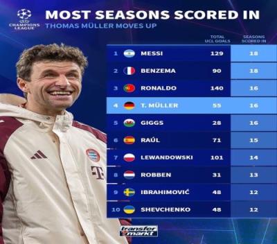 穆勒已在16个欧冠赛季中都完成进球,仅次于本泽马和梅西