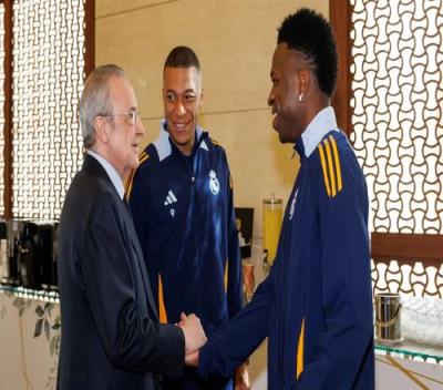 皇马官网展示了一线队球员今天的动态,俱乐部主席弗洛伦蒂诺前往卡塔尔,与正在备战洲际杯决赛的球员亲切会面,其中就包括维尼修斯。维尼修斯在镜头前显得心情不错。