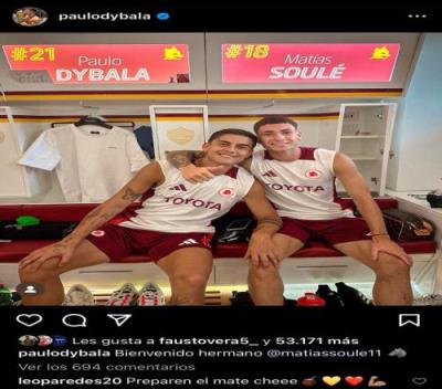 迪巴拉社媒晒与苏莱在罗马更衣室的合照,帕雷德斯:准备马黛茶