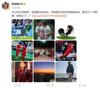 在个人微博,林良铭晒出多张今年为国家队以及国安出战的照片,同时配文:“2024年已到尾声,有遗憾也有成长。仰望星空同时始终脚踏实地。愿2025一切顺意,拼就完了!”