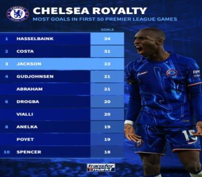 把范围放大到整个英超历史,杰克逊的前50场英超进球数也高于苏亚雷斯、卢卡库和鲁尼,他的数据排名第31位,排名榜首的是哈兰德的50球。