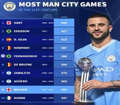 德转列曼城新世纪出场榜:乔哈特压埃德森居首,沃克第9
