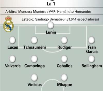 体育资讯1月16日报道宣称 北京时间周五凌晨的国王杯1/8决赛,皇马将和塞尔塔交手。《世界体育报》对本场比赛皇马的首发阵容进行了预测,维尼修斯和姆巴佩组成双前锋,卢宁把守球门。
