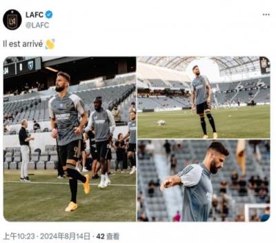 体育资讯8月14日报道宣 洛杉矶FC更新社媒动态,晒出吉鲁赛前热身的照片。