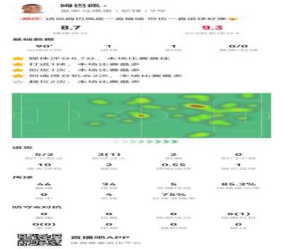 姆巴佩本场1球1助攻5射2正1失良机+5关键传球8.7分全场最高