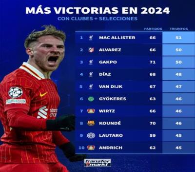 体育资讯1月3日报道宣称 德国转会市场统计了2024年球员在俱乐部和国家队的取胜场次,并列出2024年球员胜场排名,麦卡利斯特51胜居首,阿尔瓦雷斯、加克波50胜次席。