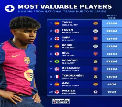 因伤缺席国家队球员身价榜:亚马尔、福登1.5亿欧居首,萨卡1.4亿
