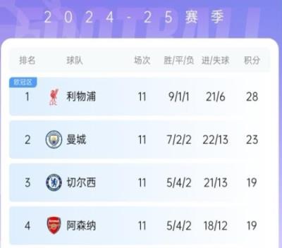 英超第11轮,阿森纳客场1-1战平切尔西。本轮过后,阿森纳暂列积分榜第四,距离榜首的利物浦有9分之差。