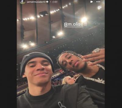 穆西亚拉携家人前往美国度假,他也在今天通过社媒晒出动态,和队友奥利塞现场观战了NBA比赛。