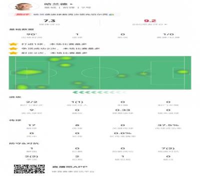 哈兰德全场数据:2次射门1进球,仅触球17次,评分7.3分