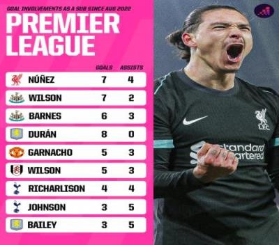 据Opta统计,努涅斯2022-2023赛季以来联赛替补出场参与11粒进球,英超球员同期最多。