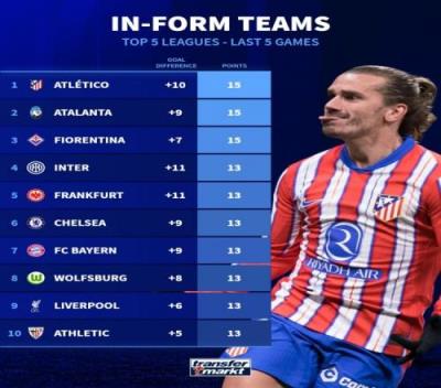 体育资讯12月13日报道宣称 德国转会市场统计了五大联赛球队近5场比赛拿到的积分,并列出五大联赛状态榜,马竞、亚特兰大、佛罗伦萨拿满15分居首。