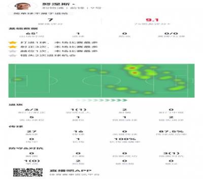 努涅斯本场数据:6射3正,1粒进球,2次错失良机,评分7.0