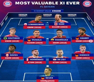 体育资讯2月8日报道宣称 《转会市场》统计了拜仁队史球员身价最贵阵容,莱万、凯恩领衔。