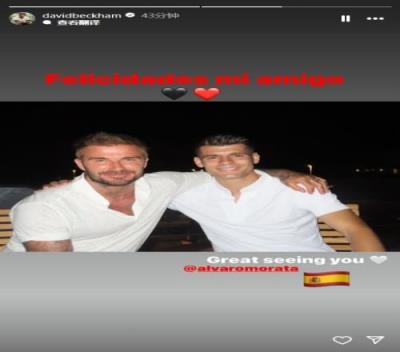 前米兰旧将贝克汉姆更新社媒,晒出同莫拉塔的合照,表示道:“祝贺你,我的朋友,很高兴见到你加盟米兰”。
