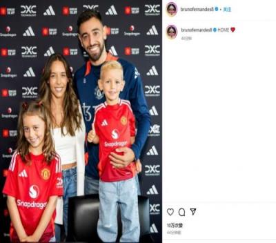 B费也通过社媒晒出自己携妻子、女儿、儿子一起现身续约现场的照片,并一语双关配文:“家 ❤️”