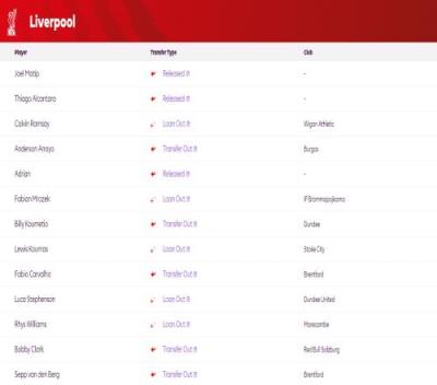 今夏利物浦离队球员: