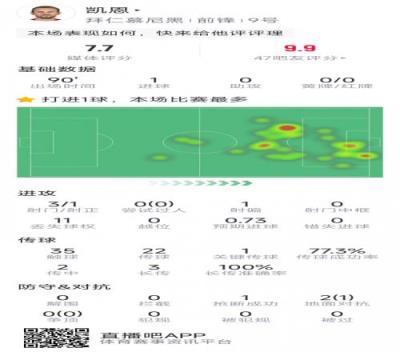 凯恩本场数据:1粒进球,3射1正,1次关键传球,评分7.7分