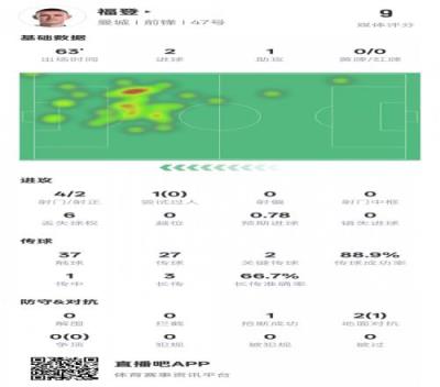 福登本场比赛数据:2射1传+2关键传球,评分9.0