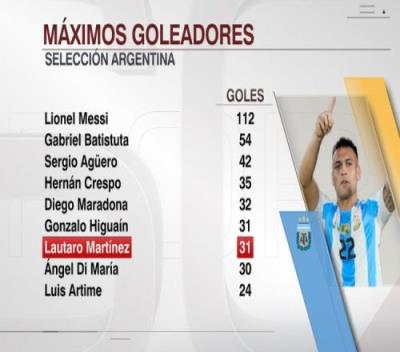 据ESPN统计,劳塔罗为阿根廷队打进31球,追平伊瓜因,排名阿根廷队史射手榜并列第6位。