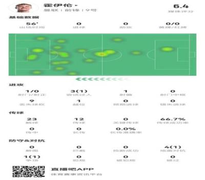 霍伊伦本场数据:1射0正3过人1成功5对抗2成功获评6.4分