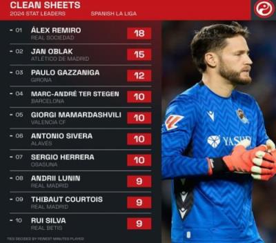 体育资讯12月28日报道宣称 年终岁末,《Squawka》盘点了西甲门将零封榜top10,皇家社会的雷米罗以18次位居榜首,马竞门将奥布拉克以15次位居第二。