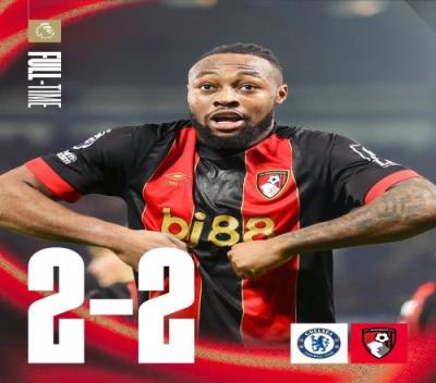 体育资讯01月15日报道宣称 英超第21轮,伯恩茅斯2-2战平切尔西,目前积34分排在英超第7,仅落后第4的切尔西3分。