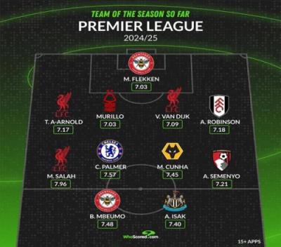 WhoScored本赛季至今英超最佳阵容(至少出场15次)