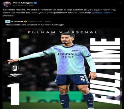 体育资讯12月9日报道宣称 在刚刚结束的英超第15轮比赛中,阿森纳1-1战平富勒姆。赛后,知名枪迷、英国名嘴皮尔斯-摩根吐槽了球队的表现和阿尔特塔的引援。