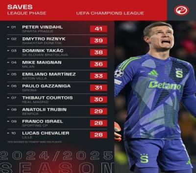 欧冠扑救榜:文达41次居首迈尼昂、马丁内斯、库尔图瓦进前10