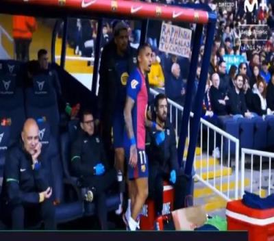 体育资讯2月3日报道宣称 本轮西甲,巴萨1-0小胜阿拉维斯,Movistar镜头拍到,拉菲尼亚在下场时对裁判的判罚表达了不满。