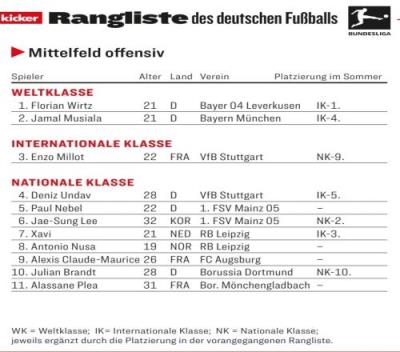 体育资讯1月6日报道宣称 德甲上半程已经完赛,《踢球者》按照惯例对上半赛季各位置球员进行评级,进攻型中场位置如下: