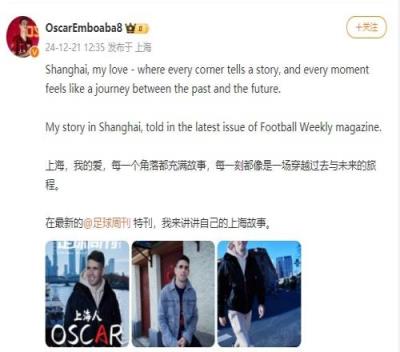 体育资讯12月21日报道宣称 在结束2024赛季的各项赛事后,海港外援奥斯卡已经回到巴西休假。今日奥斯卡更新微博,对自己的的专访进行预热的同时,也表达了自己对上海的热爱。