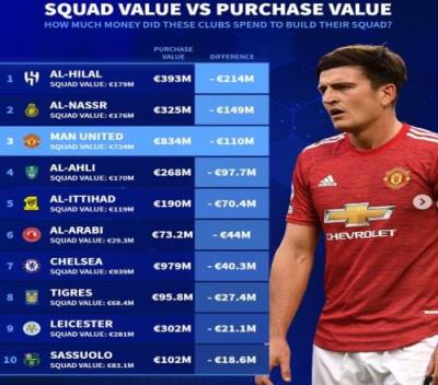 德转当前阵容引援贬值榜:前5名沙特4队,曼联第3&多花1.1亿欧