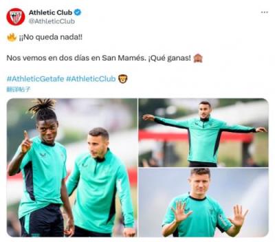 毕尔巴鄂竞技晒出尼科-威廉姆斯与队友在训练中的照片,并配文写道:“没有多少时间了!两天后圣马梅斯见,等不及了!”