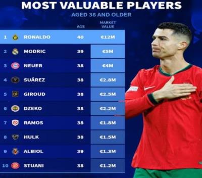 体育资讯2月6日报道宣称 《转会市场》统计了38岁及以上球员身价榜,40岁的C罗居首。
