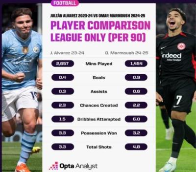 数据网站OPTA盘点了马尔穆什本赛季在法兰克福以及阿尔瓦雷斯上赛季效力曼城时的联赛数据,具体如下(每90分钟数据):