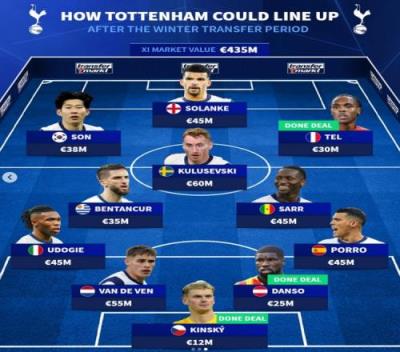 体育资讯2月4日报道宣称 德转盘点了热刺在冬窗过后可能排出的首发阵容,其中新援丹索、特尔、金斯基在列,以下为具体阵容: