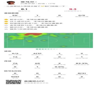 亚马尔本场6射4正进1球+2中框+1失良机2关键传球获评8.1分