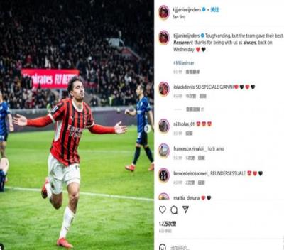 赖因德斯也在赛后晒出自己进球后的庆祝照,并配文:“很难接受的结局,但全队已经竭尽全力。米兰球迷们:感谢你们一如既往的支持,周三再见!”