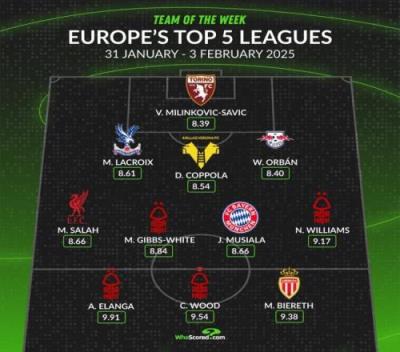体育资讯2月5日报道宣称 本周五大联赛已经完赛,whoscored也统计了本周评分最佳阵容,诺丁汉森林4将在列。