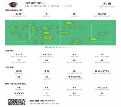 伊萨克本场数据:2射2正1进球,2次关键传球,评分7.8